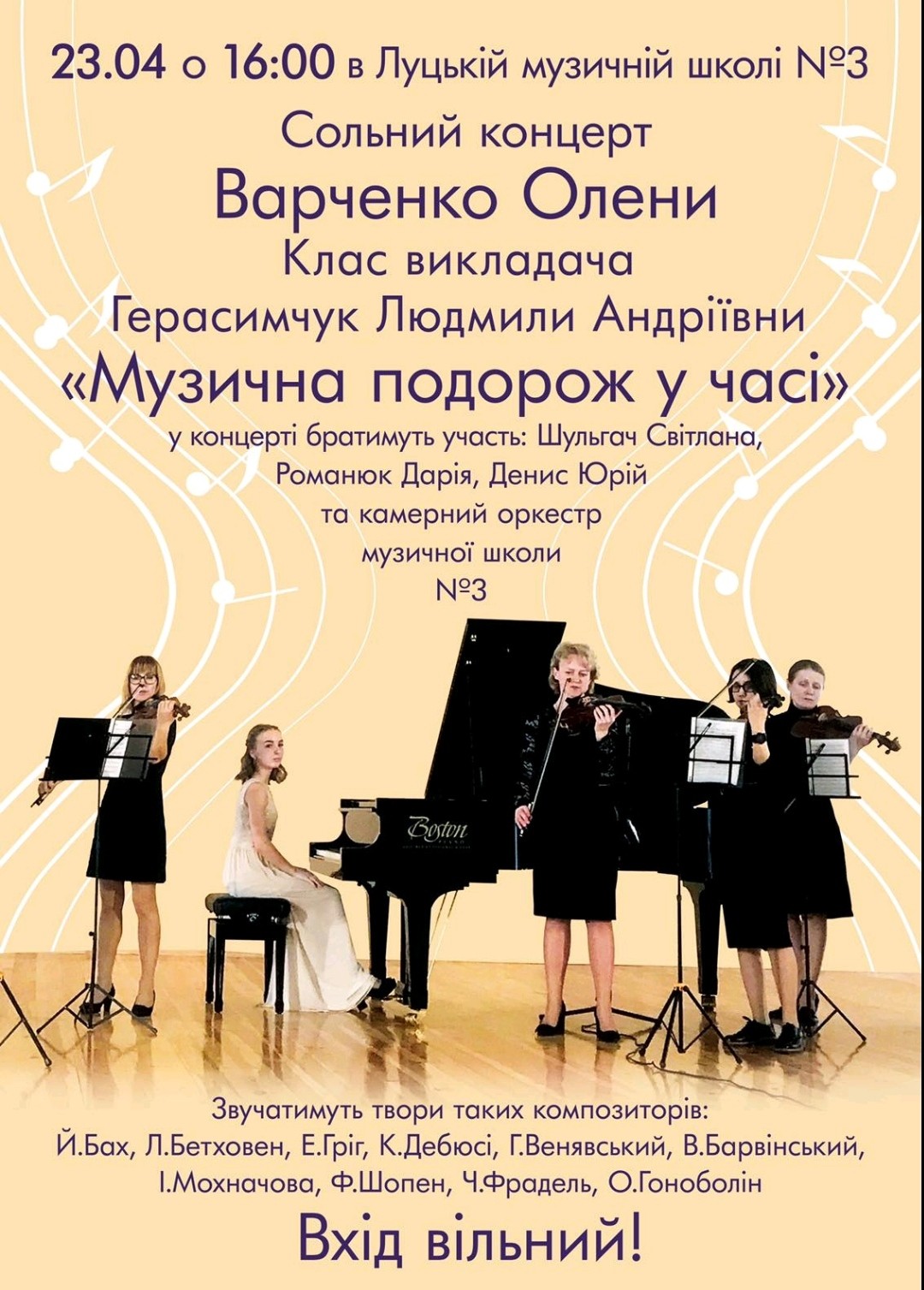 23 квітня 2021 року в Луцькій музичній школі №3 відбувся концерт випускниці відділу фортепіано, багаторазового лауреата міжнародних, всеукраїнських та обласних конкурсів та фестивалів Олени Варченко, класу викладача Герасимчук Людмили Андріївни «Музична подорож у часі». Відчуття гордості та радості переповнювало усіх слухачів. Велика праця педагога та її учениці вилилась в справжнє свято. Зі сцени лунали твори зарубіжних класиків та українських композиторів: Й.Баха, Л.Бетховена, Е.Гріга, К.Дебюсі, Г.Венявського, В.Барвінського, І.Махнючової, Ф.Шопена, О.Гоноболіна.