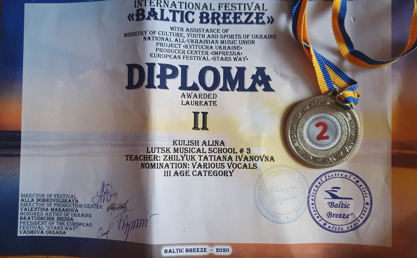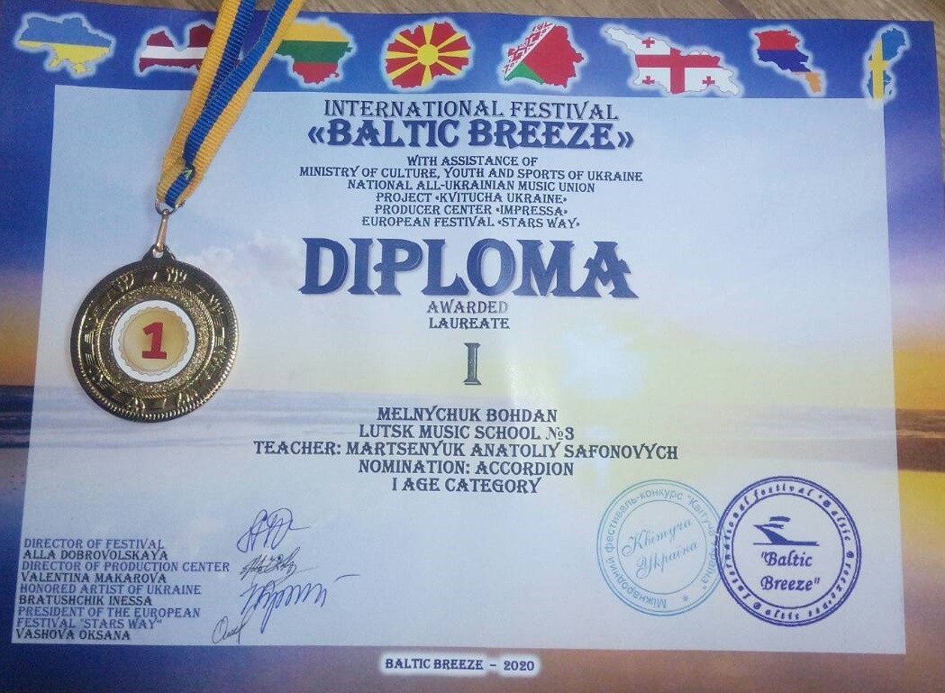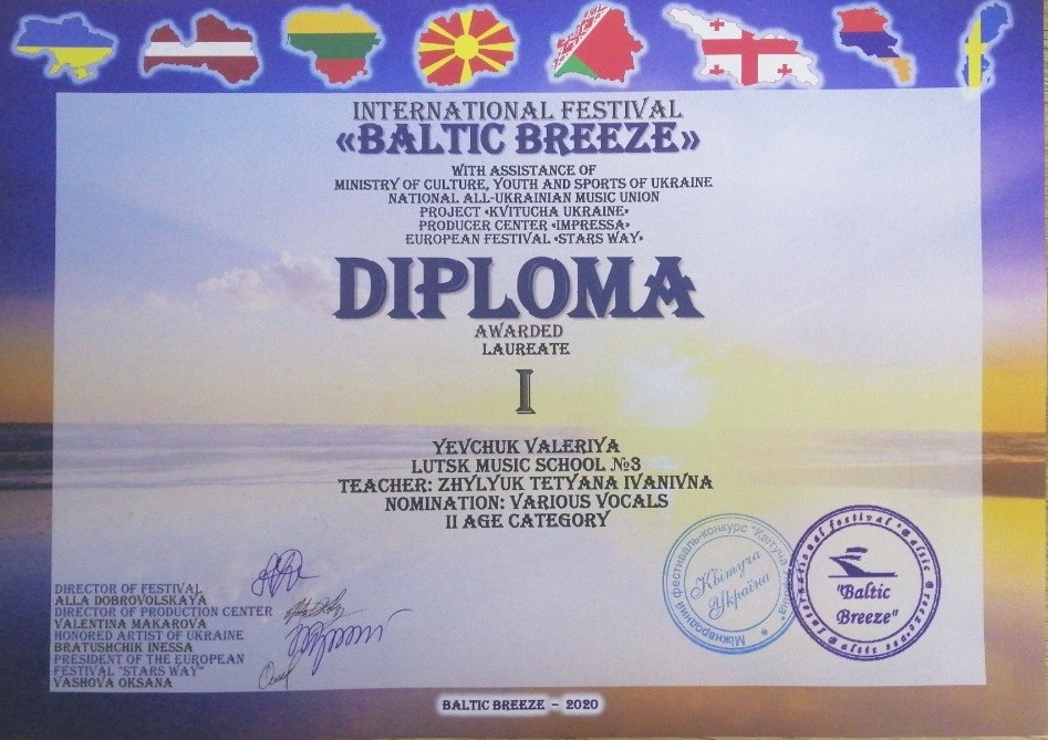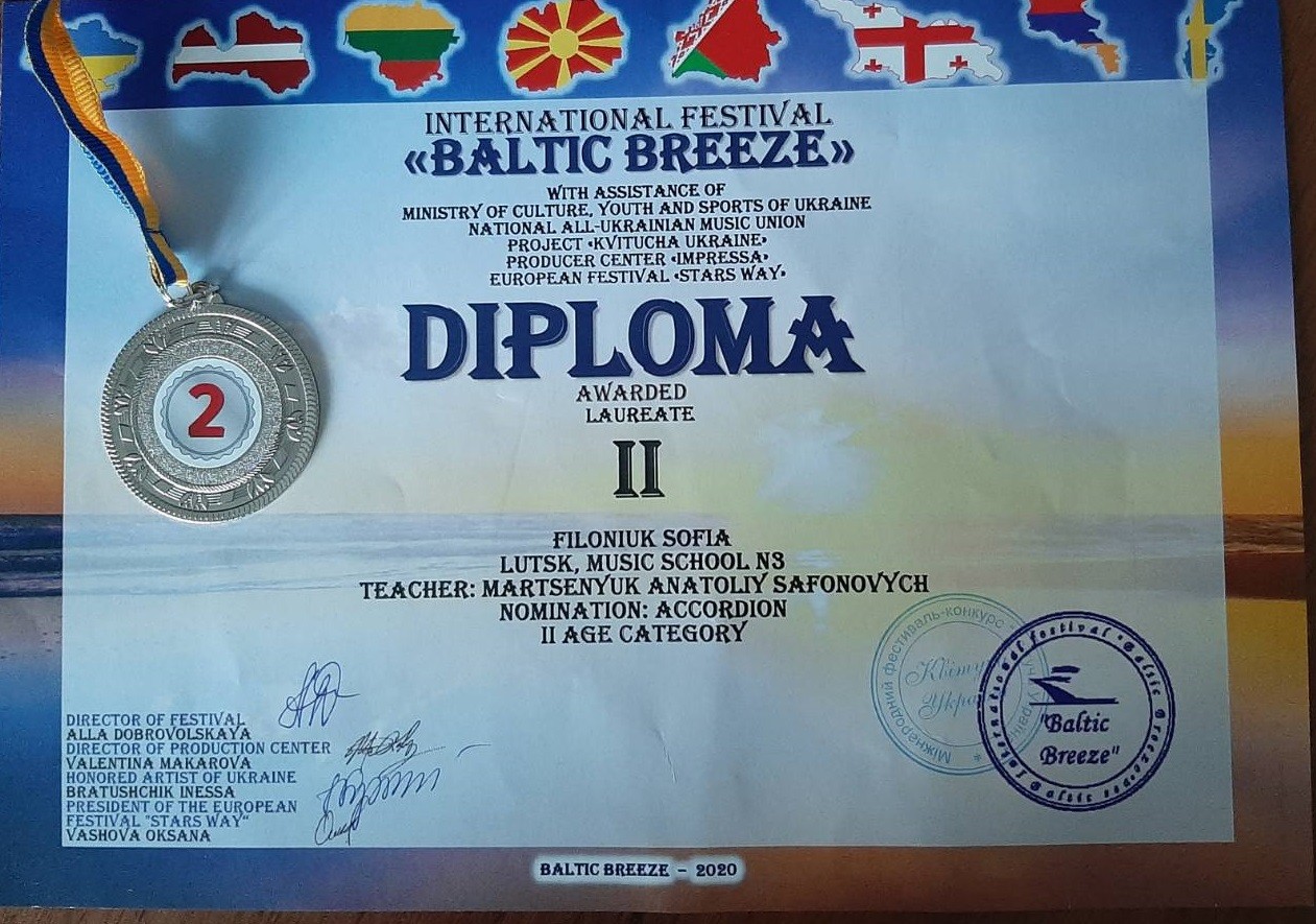 2. Міжнародного конкурсу–фестивалю «International COMPETITION – festival BALTIC BREEZE», який відбувся 16 травня 2020 року у місті Рига (Латвія):