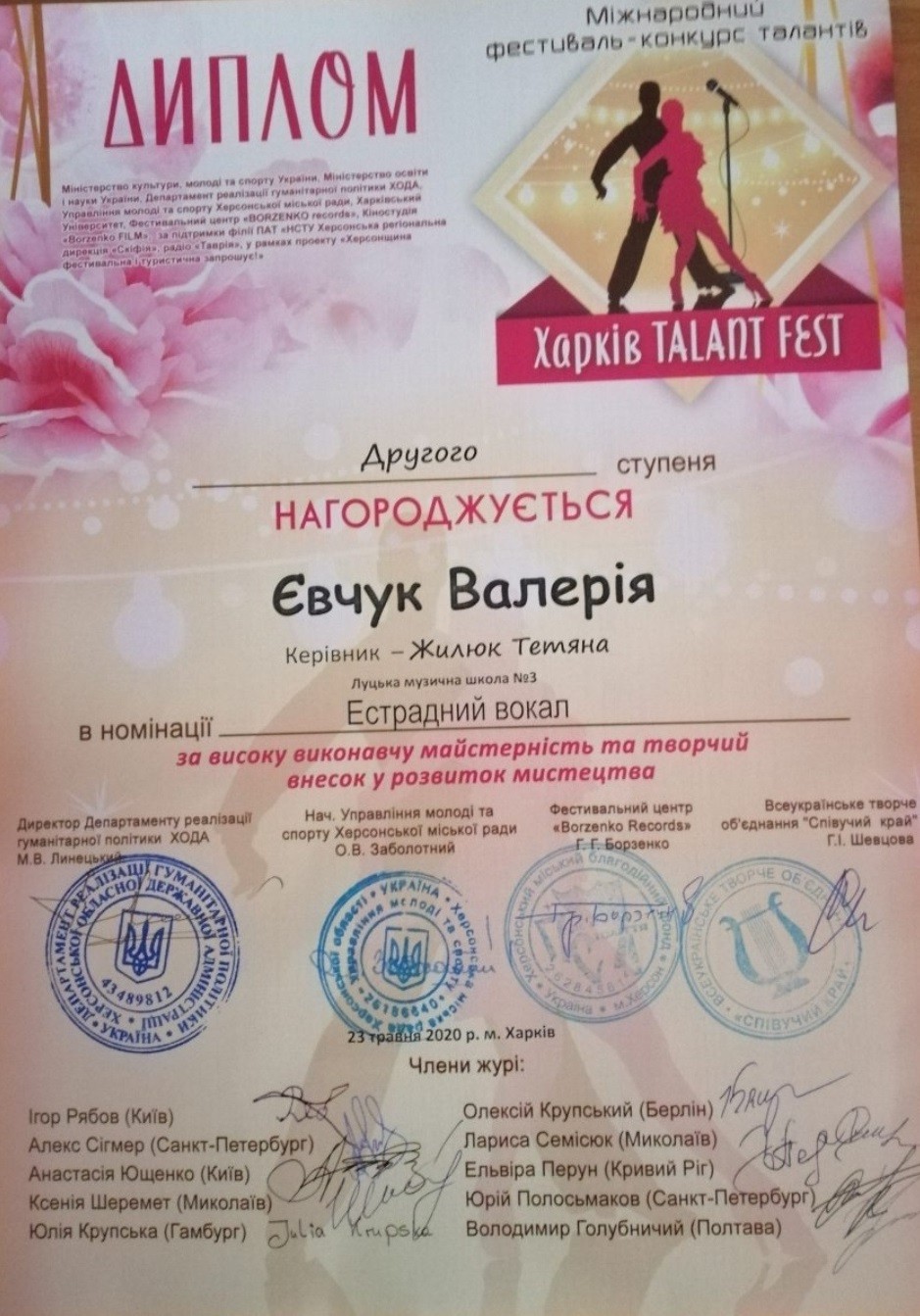 5. Міжнародного фестивалю-конкурсу талантів «Харків Talant Fest», який відбувся в Харкові 23 травня 2020 року:
