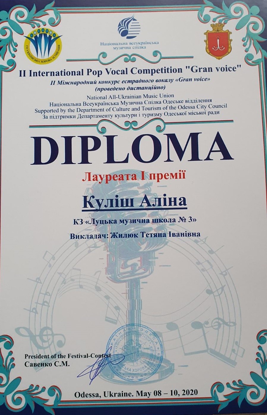 3. II Міжнародного конкурсу естрадного вокалу «GRAN VOICE», який відбувся в Одесі 18 травня 2020 року: